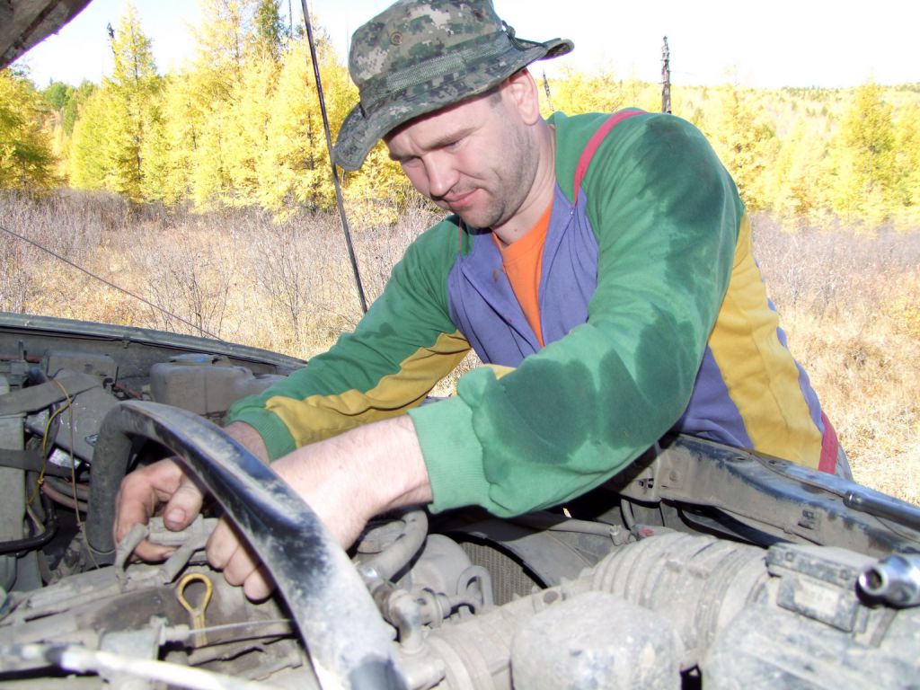 Догоняем чуть удалившегося Мотоса. Он стоит задрав капот. Снова чего крутит.