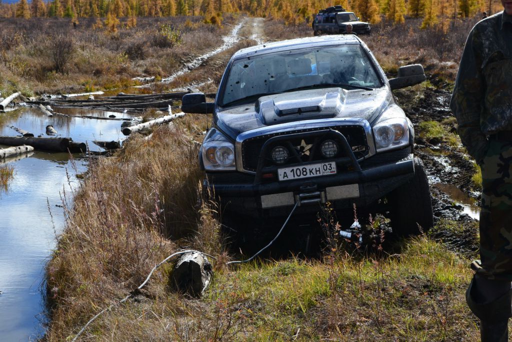 Очень быстро начинает темнеть. Еще 500 метров и мы должны встать на долгожданный сон. Ехали мы их 40 минут. В виду того что Мотос рванул по короткой дороге. Напрямик через болото. Где как обычно прилип по самый бампер Додж. Засада. Хоть бросай его. Сил нет уже ни каких. Разматываю лебедку на максимум и цепляю за сосну диаметром 30 см. Тянем потянем, вытянуть не можем. Сосна тихо мирно была вырвана с корнем. Так. Что то не так. Нет бы остановиться но некогда думать. Разматываю стропу и зацепляю за вторую сосну в диаметре уже см 50. Тянем тянем, вроде трос наматывается, а машина совсем по чуть чуть сдвигается вперед. Смотрю на его кузов, и ебическая сила, мост остался в говнище, а все остальное медленно вытягивается из болота. На вскидку лифт морды получился см 40. Все линки вытянулись в струнку. Лебедку на обратку и все встало на свои места. Вперед тянуть не пойдет. Объезжаю его и пытаюсь дернуть назад. Камап 9500 останавливается. Вот же зараза какая. Но все же с третьего раза удается помаленьку его вырвать из водного плена. По сухому объезжаем засадное место и до табора где уже костер горит и готовится ужин.