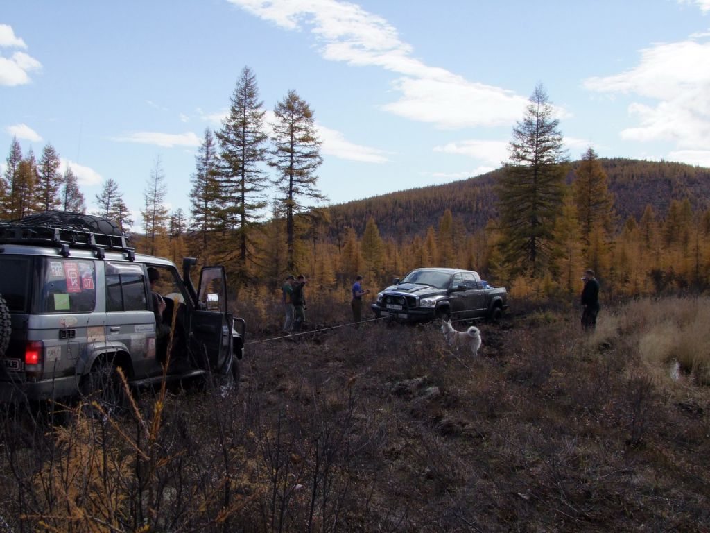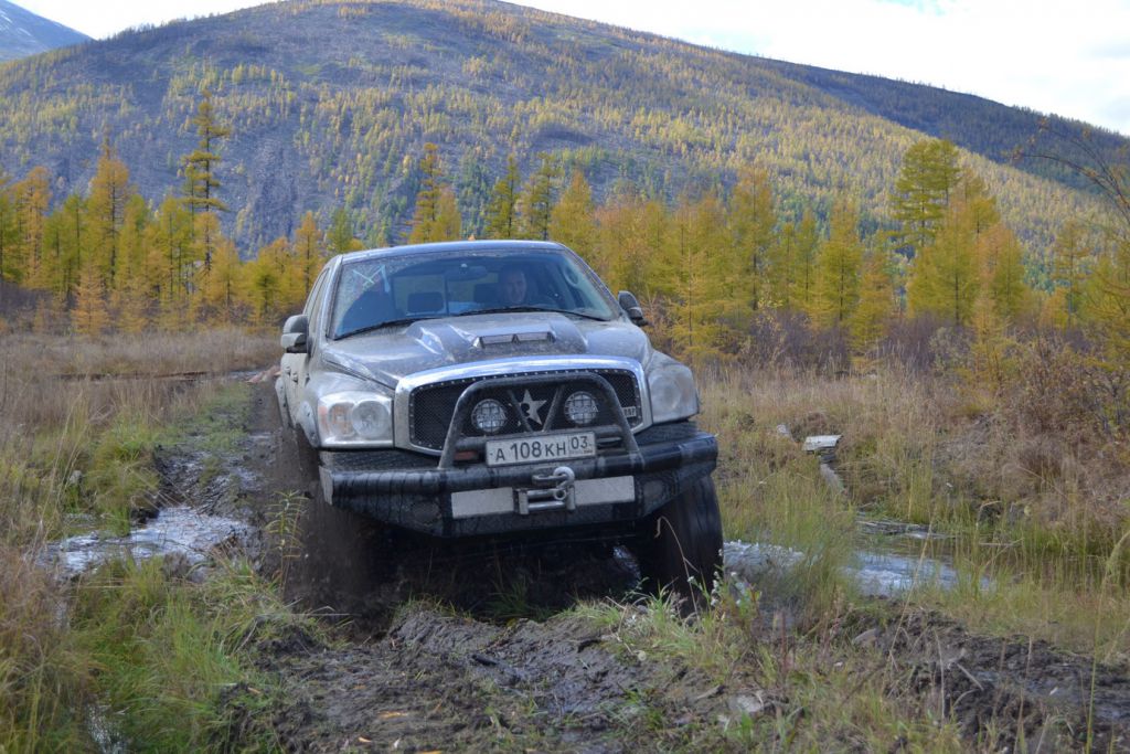 Люфт просто офигенный. Ничего хорошего это не сулит. Снимаю хаб и проверяю как ступичные подшипники затянуты. Гайка крутится от руки. Ну ладно если только гайка. Подтягиваю её. Люфта нет. Ура. Собираю все обратно и довольный на всю морду укладываю шмурдяк. Отчаливаем в дальний путь. По ревизии подвески на Додже выяснили, что отбойник был потерян в последнее яме. Так посадочное не имел признаков грязи, воды и прочего. Поэтому Володя первым поехал рыться во вчерашней последней яме на болоте. МЫ тоже отправляемся вслед за ним и помогаем разбив лед искать эту зласчастную резинку. Ничего не нашли. Едем дольше. Разговариваем о природе, женщинах и машинах. Мимо проплывают водяные лужи, каменные реки и прекраснейшие озера. В отражении которых видны горы. Пейзаж насыщен яркими красками осени, голубым небом и чистой спокойной гладью озера. Жизнь тут медленна, нерасторопна и прекрасна во всех своих проявлениях.