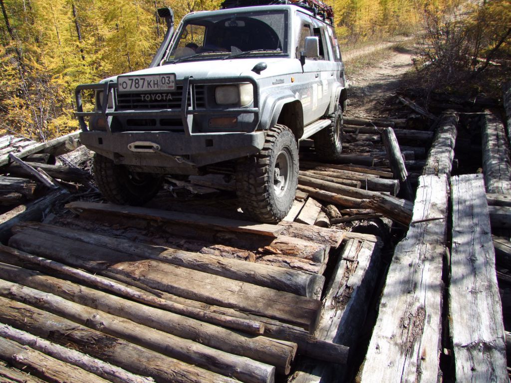 Завтракаем и радостные разбредаемся в разных направлениях. Я принимаю свою любимую позу возле правого переднего колесика. Серега балду пинает по округе. Владимир тоже чего-то смотрит в машине. За вчерашний день ей досталось не мало. Из того что определили на месте – загнута рулевая, согнут амортизатор передний, оторван отбойник переднего моста, разорван пыльник на рулевой, оторван какой то провод зачем-то закрепленный пластиковыми струбцинками прямо под балкой. В общем подешевела машинка на чуть, чуть. Беру Хай-джек у Володи вместе с подставкой и поднимаю машинку свою. Колесо скидывается