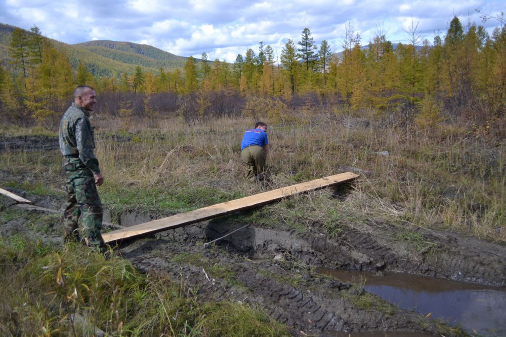 Приходится думать как протащить большого бегемота. Маленький бегемот отошел на второй план. Все лавры звезды достаются теперь не ему. Не застревает почти. Нам здорово повезло, что на самых засадных местах кто-то бережно оставил кучки свежего горбыля который укладывался нами в колею, чтобы облегчить жизнь. Иногда доски мстили своим обидчикам и хорошо что не по голове прикладывали сверху.