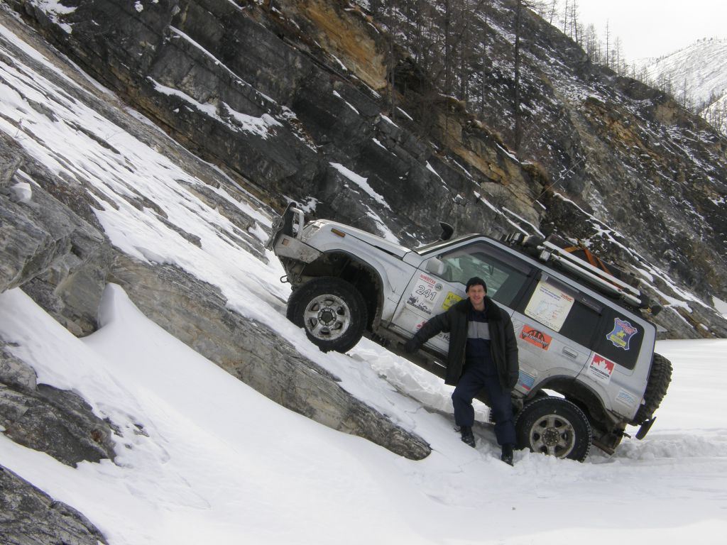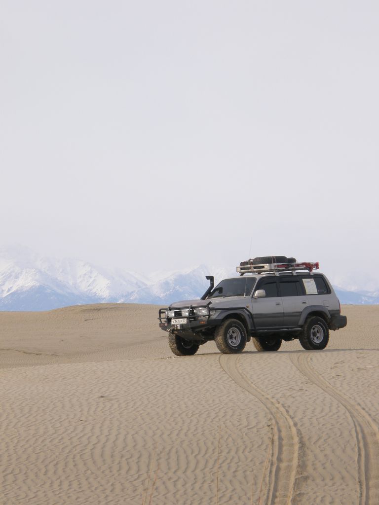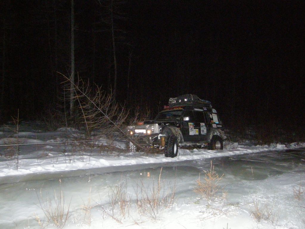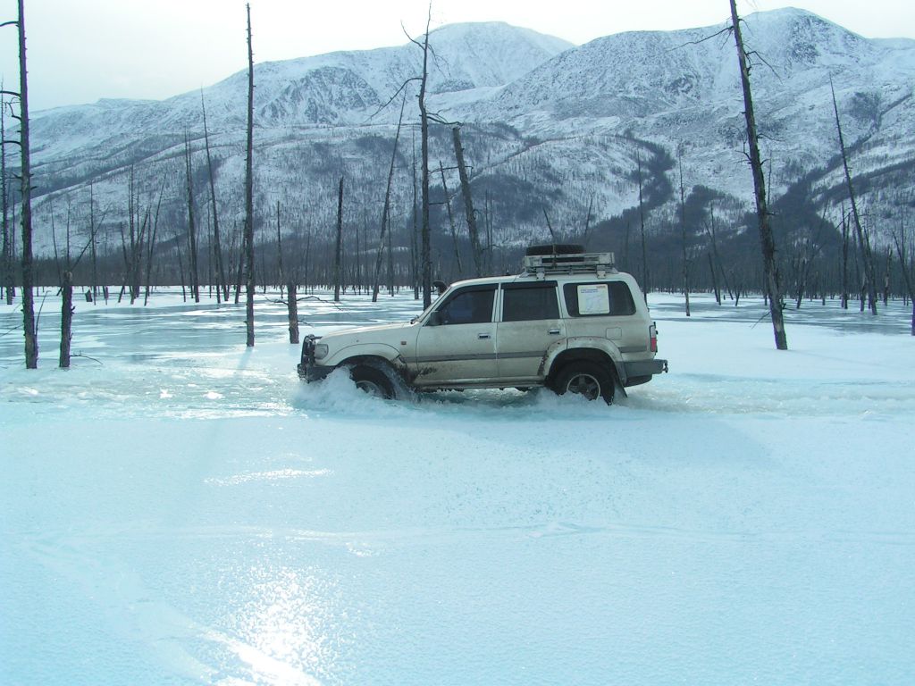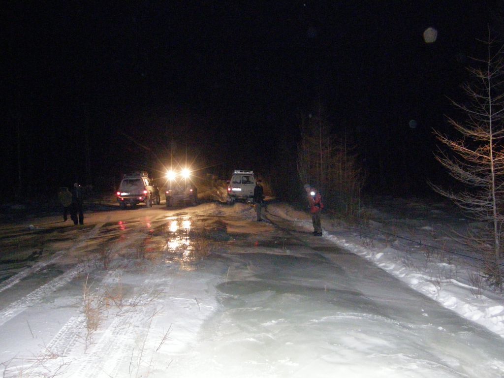 Тулдунь интересная речка. Небольшая, но от берега до берега залита наледями и все это вспучено. Все время едешь выше берегов метра на 1,5-2. При выходе в широкую долину бугров становится меньше, но появляются свежие наледи, едем прямо по воде. Дорога идет местами берегом, но по берегу ехать тряско и мы утыкаемся то в наледь то в завалы.