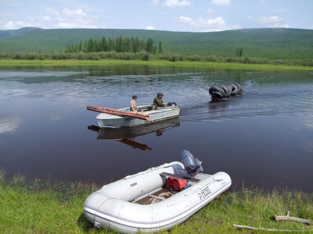 Переправа. Все как на учениях, без особых проблем.  Единственный вопрос – резиновая лодка не в состоянии тянуть плот, встает  свечкой. Пробуем толкать – получается, но нет возможности управлять процессом.  Так тоже не годится. Выход найден быстро, одна лодка тянет на длинной веревке,  задавая направление, вторая толкает сзади.