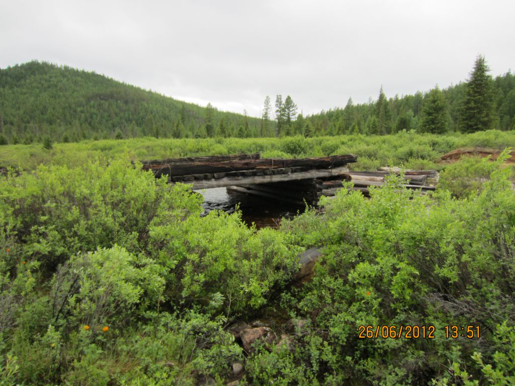 Дорогу, которую мы нащупали два года назад сейчас раскатали – не узнаешь. Тогда мы ломились сквозь стену кустарника, а сейчас весьма наезжено. Кто туда ездит и зачем??? Небольшой кусок болота на перевале сменяется отсыпанной грунтовкой. Впрочем мосты продавлены, отсыпка частично ушла в болото, но тем не менее это твердая дорога.