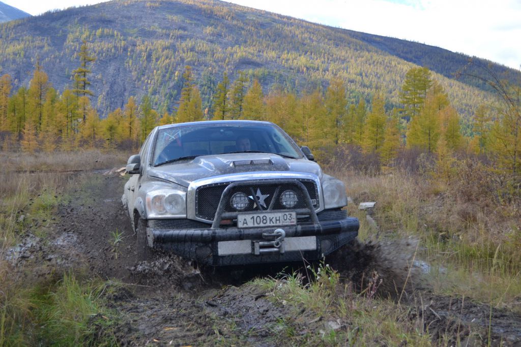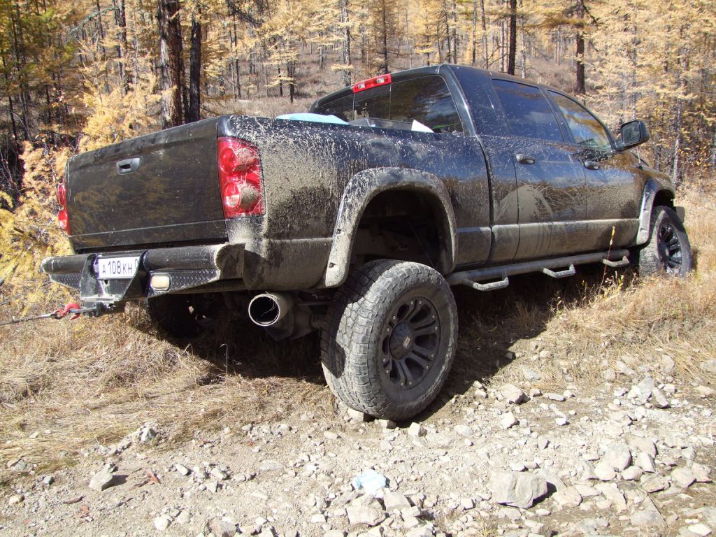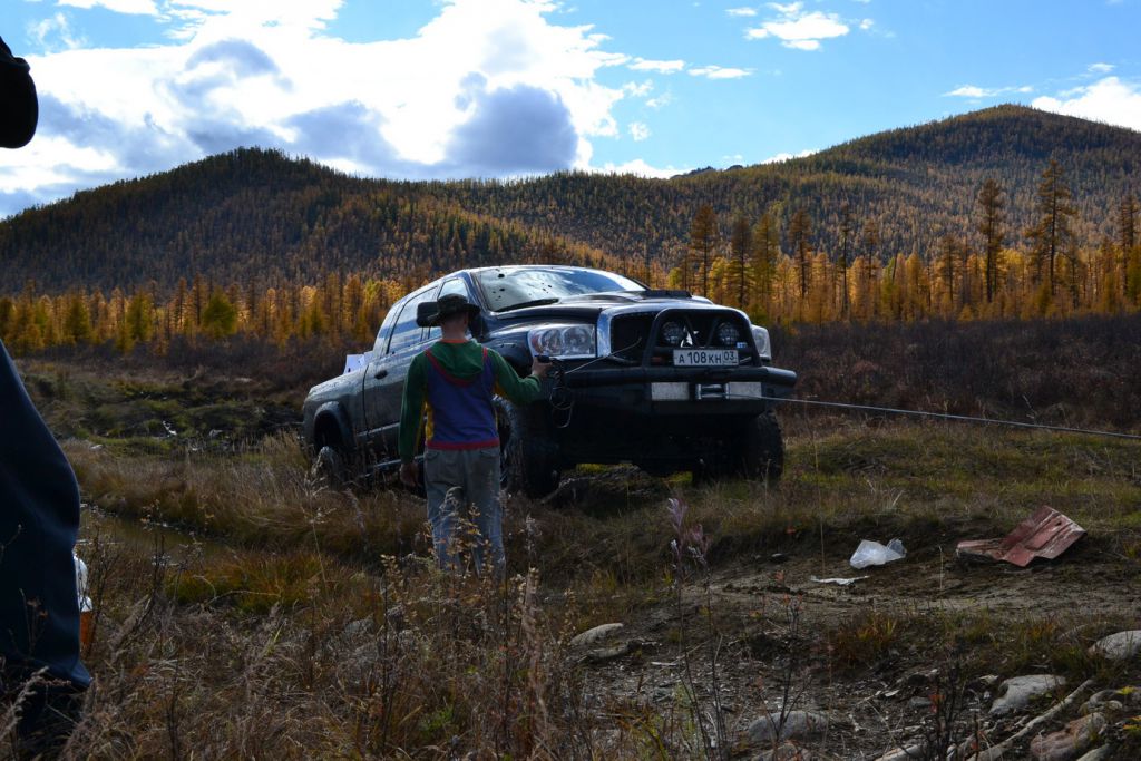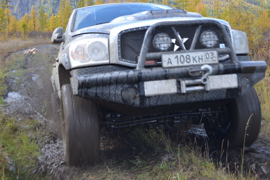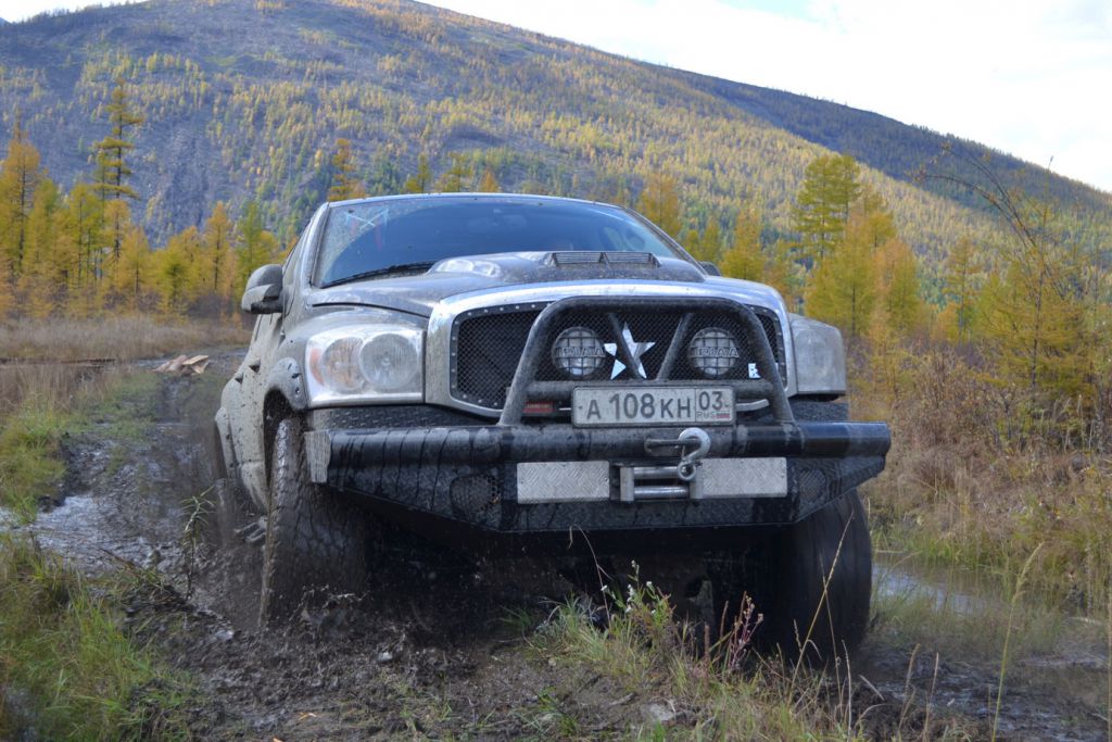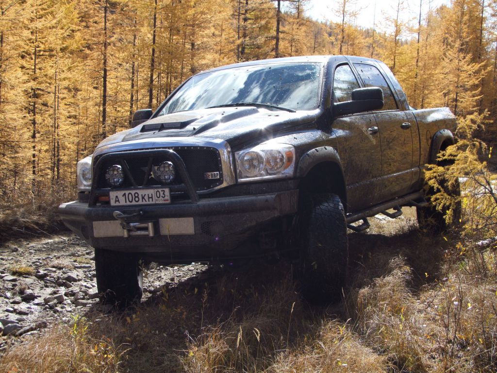 В эфире снова какая та котовасия. Толстый наткнулся на одиноко передвигающеюся машины мирно забегемотившеюся на дороге. В первом приближении ему даже не удалось определить марку машины. Только и услышали, что масса машины-бегемота как раз по мне и что она с кузовком. Издевок и юмора было много. Доберемся разберемся что к чему там. Нас то много. Выдернем. Веселимся и едем. Добираемся до точки где Толстый словил бегемота и млин млинский стоит корыто размеров с локомотив. По началу подумали, что тундра. Но чем ближе тем веселье становилось меньше. В кустах притаился всем бегемотам бегемот. Додж Рэм. Магента рисанулся и вытянул его в одну каску, пусть завидует что его малыш дернул. Все пошли пялятся на это чудо. Колесья гдето на 37с литьем на 20. Весь в обвесах сделанных на заказ. Это корытце прошло не слабый тюнинг.
