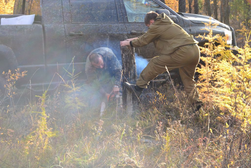 Очень быстро начинает темнеть. Еще 500 метров и мы должны встать на долгожданный сон. Ехали мы их 40 минут. В виду того что Мотос рванул по короткой дороге. Напрямик через болото. Где как обычно прилип по самый бампер Додж. Засада. Хоть бросай его. Сил нет уже ни каких. Разматываю лебедку на максимум и цепляю за сосну диаметром 30 см. Тянем потянем, вытянуть не можем. Сосна тихо мирно была вырвана с корнем. Так. Что то не так. Нет бы остановиться но некогда думать. Разматываю стропу и зацепляю за вторую сосну в диаметре уже см 50. Тянем тянем, вроде трос наматывается, а машина совсем по чуть чуть сдвигается вперед. Смотрю на его кузов, и ебическая сила, мост остался в говнище, а все остальное медленно вытягивается из болота. На вскидку лифт морды получился см 40. Все линки вытянулись в струнку. Лебедку на обратку и все встало на свои места. Вперед тянуть не пойдет. Объезжаю его и пытаюсь дернуть назад. Камап 9500 останавливается. Вот же зараза какая. Но все же с третьего раза удается помаленьку его вырвать из водного плена. По сухому объезжаем засадное место и до табора где уже костер горит и готовится ужин.