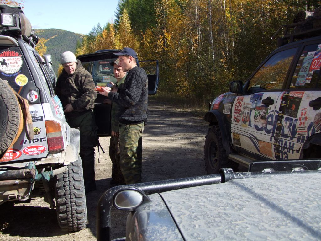 Перебродили и на педсовет. Как быть дальше. Решили что мы продолжаем движение, а остаток будет тут рыбачить, отдыхать. Отдним словом вести разгульный образ жизни. Раз разбегаемся то и шмурдяк надо выкидывать. Выбрасываю все лишнее из машины. Договариваемся где и как мы встретимся на обратном пути. И продолжаем свой путь. Цель достичь сегодня 110 и на бывшей базе геологов переночевать. Удаляемся быстро. Уходим в очередной перевал. Переползаем его. У меня совсем нет тормозов. Тащусь на спуске на пониженной. Снова купаемся в многочисленных ваннах иногда успешно преодолевая их иногда нет. Выдергиваем нашего компаньона. Кстати до сих пор не обмолвился об его имени. Он представился нам как Владимир.