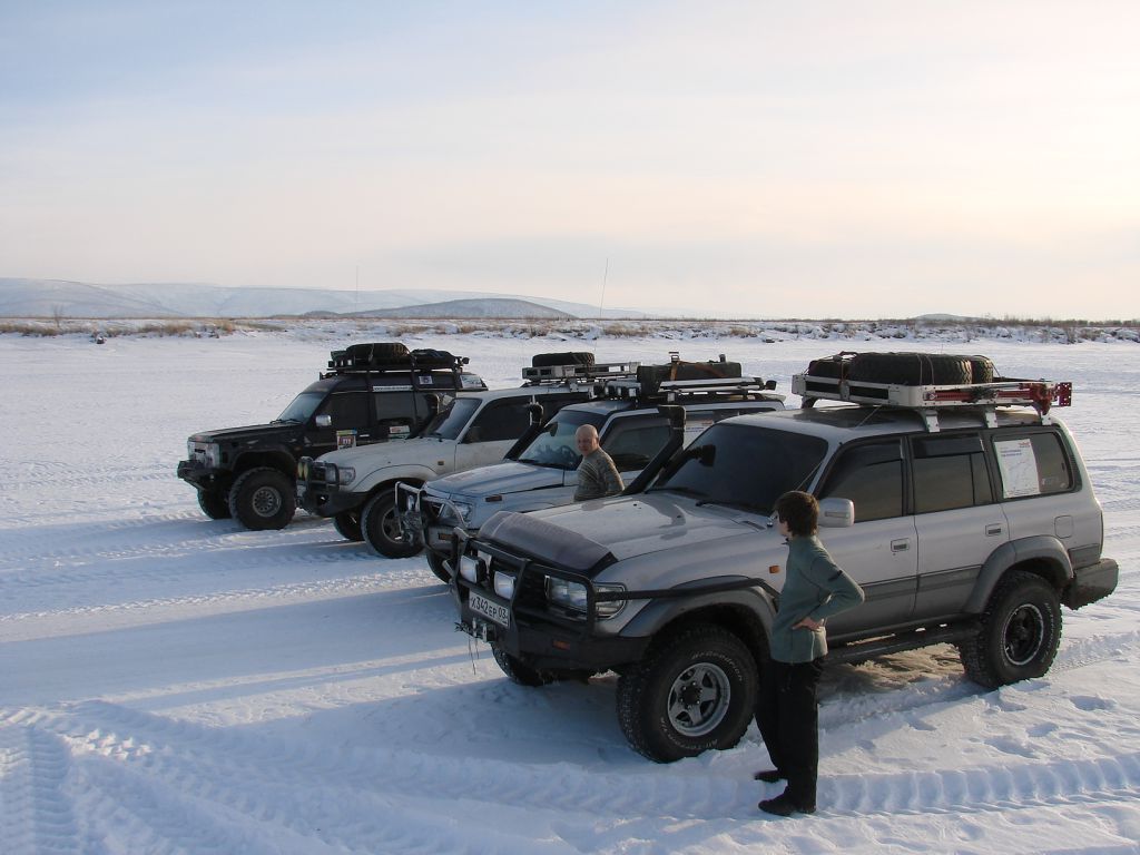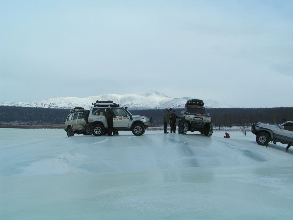 Вниз по Ципе до м\с Ую 75 км. Вьем бесконечные петли – река сильно меандрирует. В устье р. Вековьё – первая наледь. «Здравсвтуй Вековье!» Дрифт в сумерках. Едем дальше. В устье Кандакана очередная наледь. Иду первым, вижу воду. Торможу, кручу руль. Машину заносит и она идет левым боком вперед. Потом левые колеса ломают лед и машина встает на два колеса и балансирует на грани «ушей» несколько долгих секунд. На багажнике 80 литров топлива…