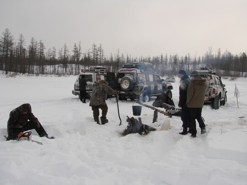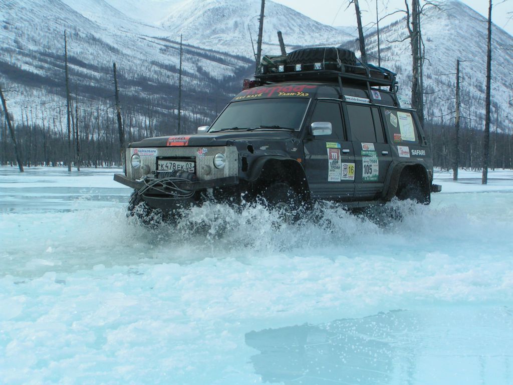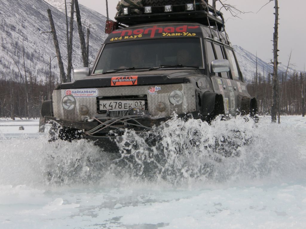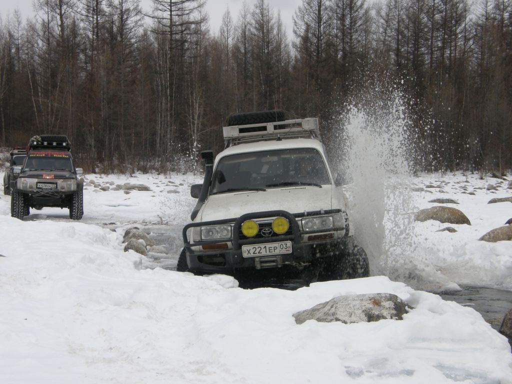 Тулдунь интересная речка. Небольшая, но от берега до берега залита наледями и все это вспучено. Все время едешь выше берегов метра на 1,5-2. При выходе в широкую долину бугров становится меньше, но появляются свежие наледи, едем прямо по воде. Дорога идет местами берегом, но по берегу ехать тряско и мы утыкаемся то в наледь то в завалы.