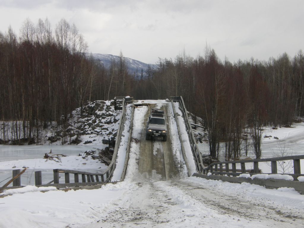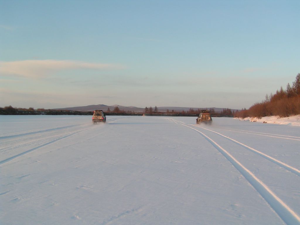 Опять грунтовка. Немного хуже качеством, но в целом очень даже ничего. Доезжаем до моста через Ципикан, спускаемся на лед. Советская власть окончательно остается за кормой. Фотосессия на фоне берегов Ципикана.