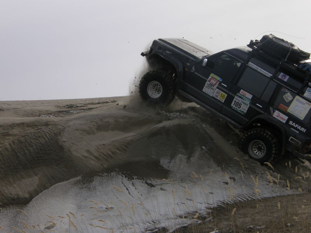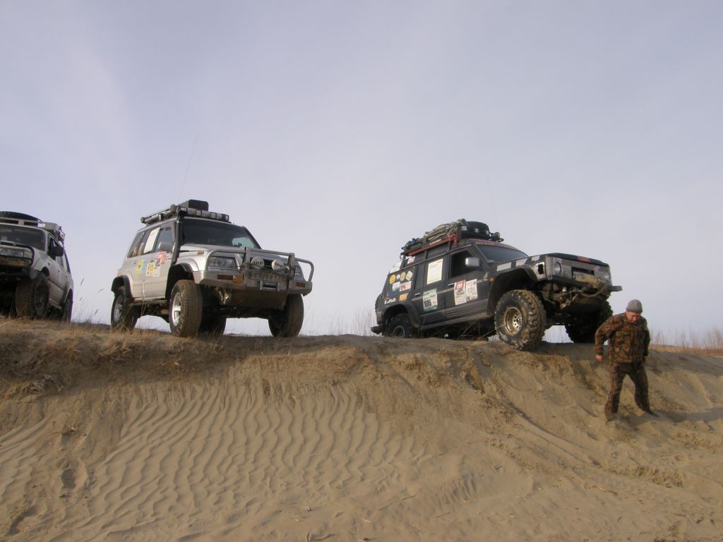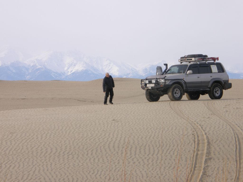 Едем по ГСД до Ины. По пути пересекаем песчаные дюны. Немного странно видеть на фоне замерзших болот и заснеженных гор настоящие барханы.