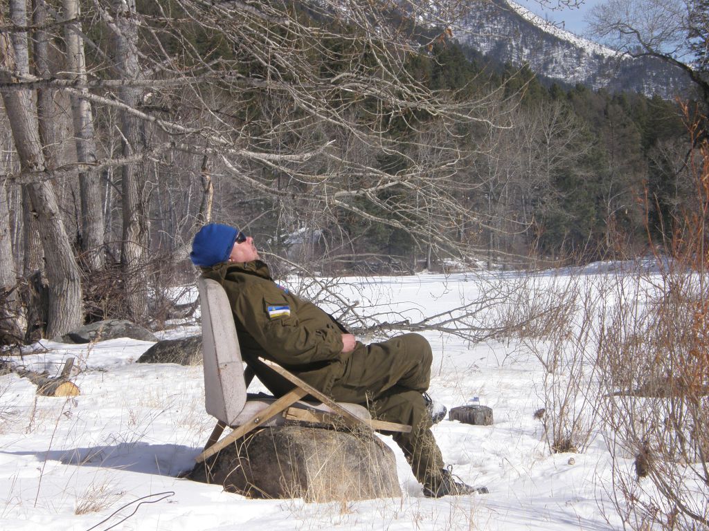 Заезжаем до мс, просимся на ночевку. Потом едем до нашей старой базы вниз по Ципе 600 м. От базы осталось два полуразрушенных зимовья. Находим хреновину странного вида и предназначения. Теряемся в догадках.